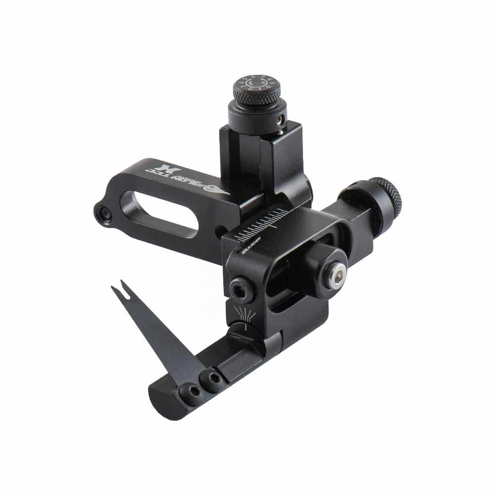 A fully adjustable compound arrow rest with micro-adjustment on horizontal and vertical planes and blade angle, complete with spare blades and tools.